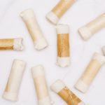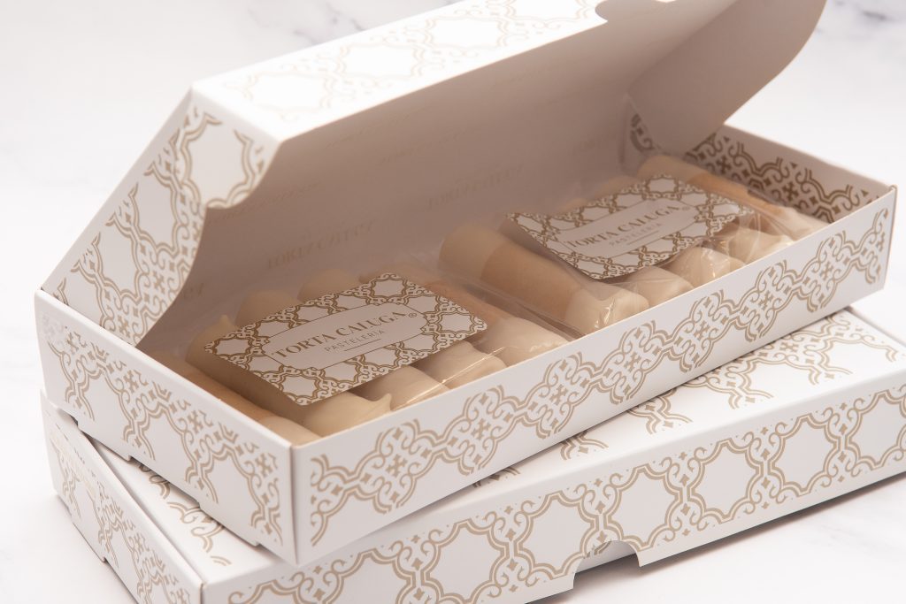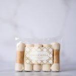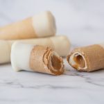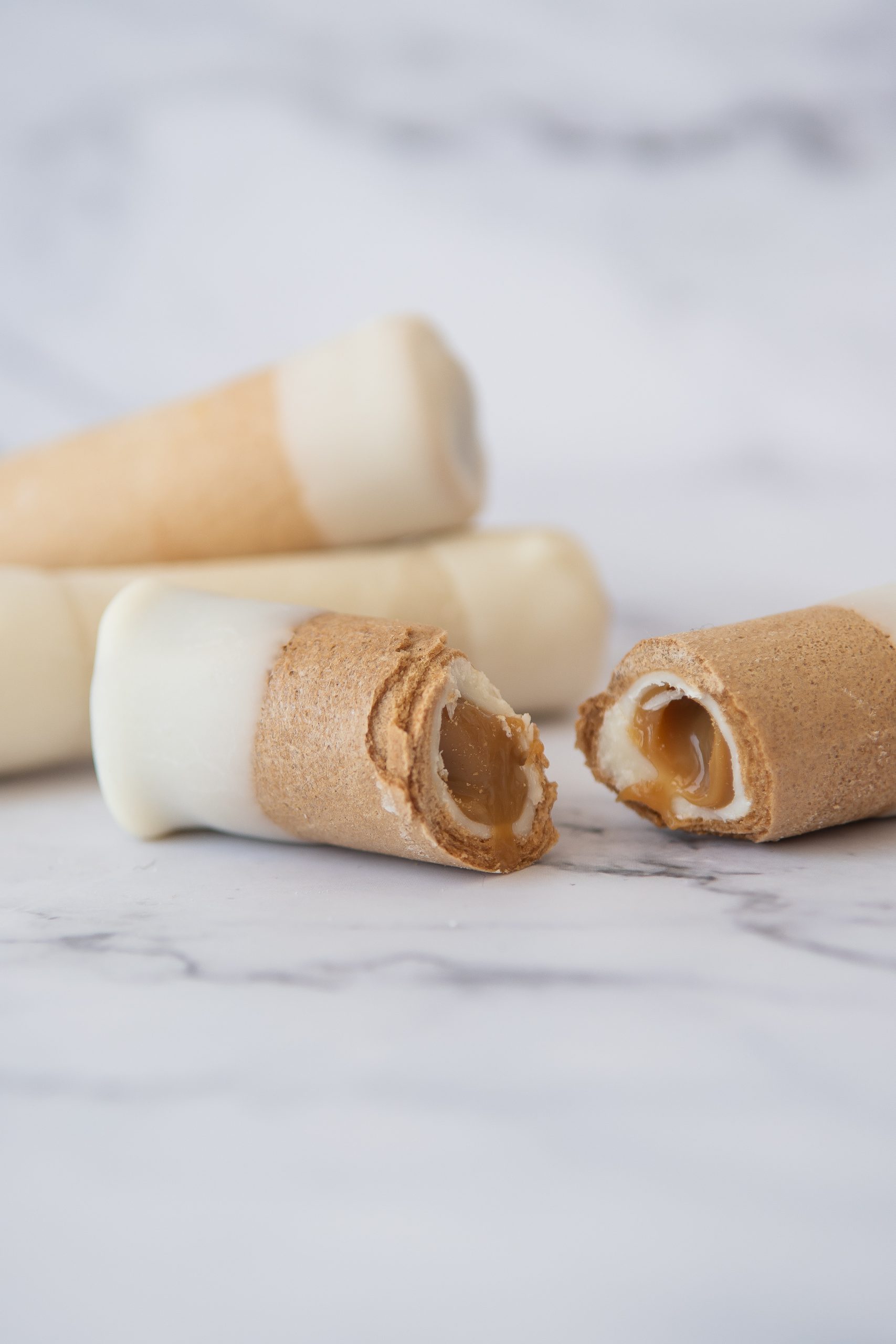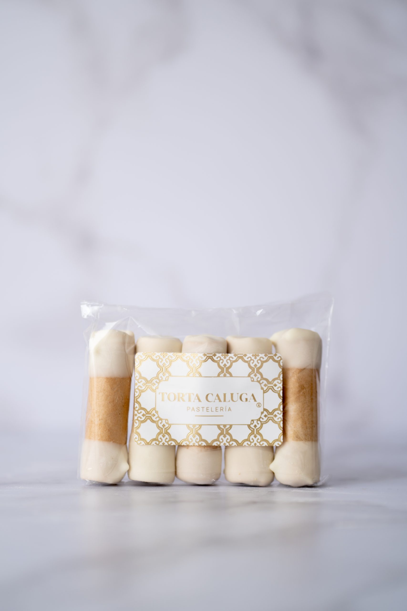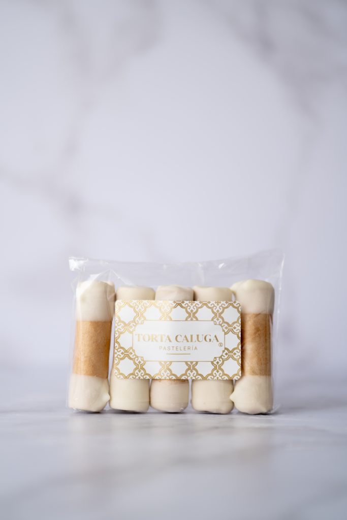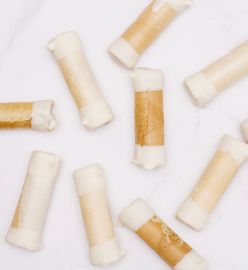 Mini barquillos crujientes, rellenos de manjar artesanal y bañados en una fina capa de chocolate blanco en su interior y extremos.