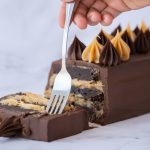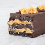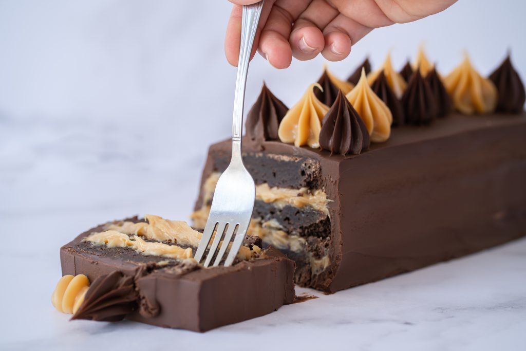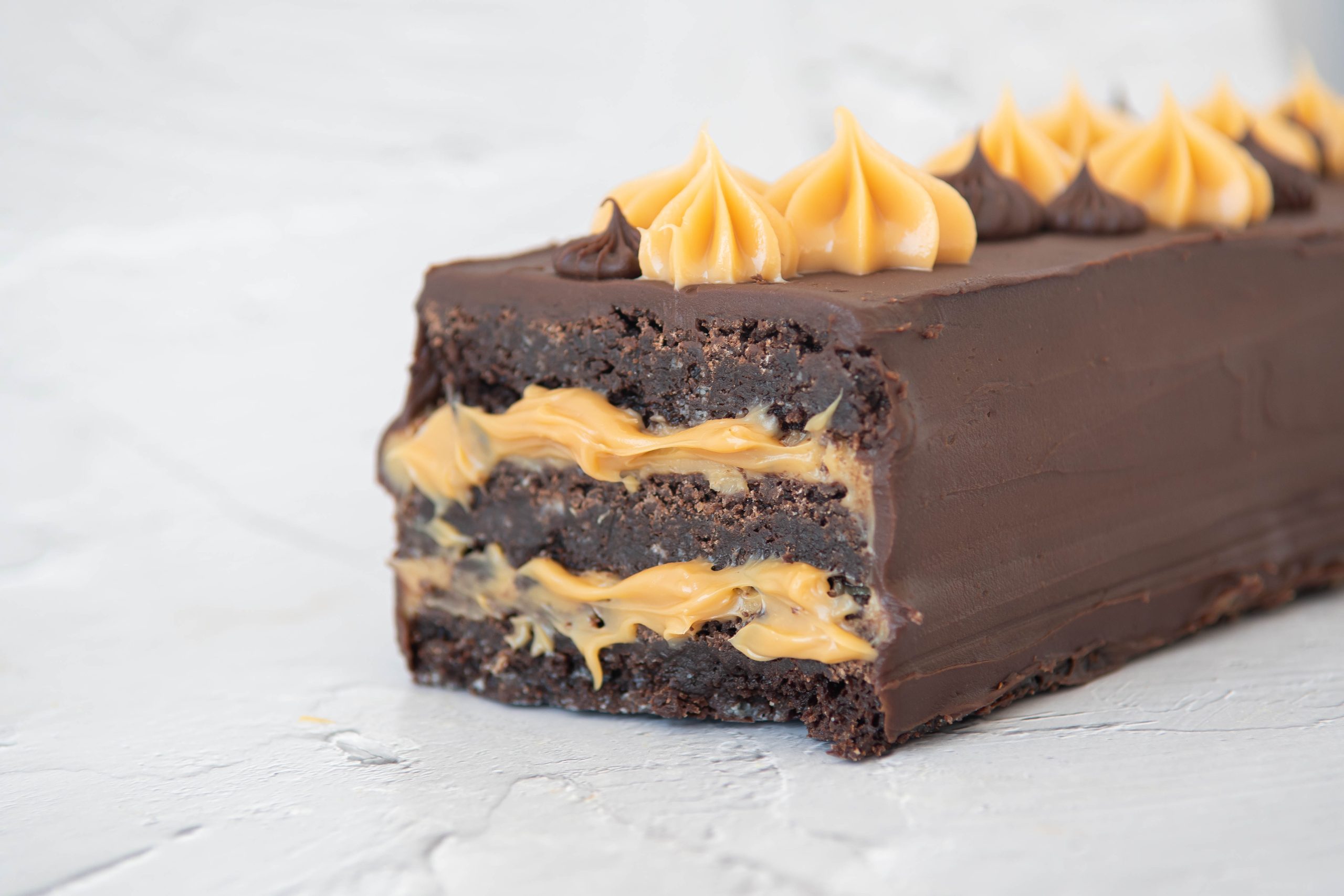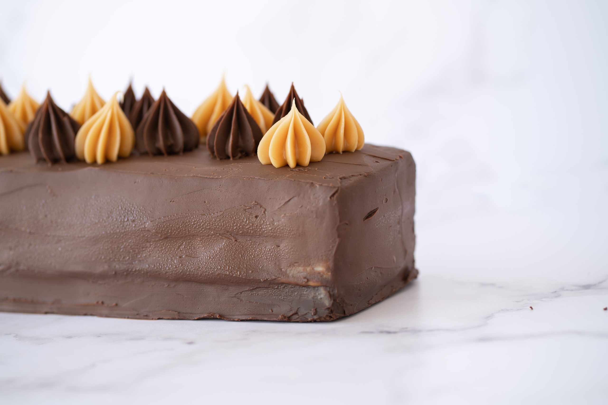 Capas de brownie, rellenas de manjar artesanal y cubierta de cremoso ganache de chocolate semiamargo.