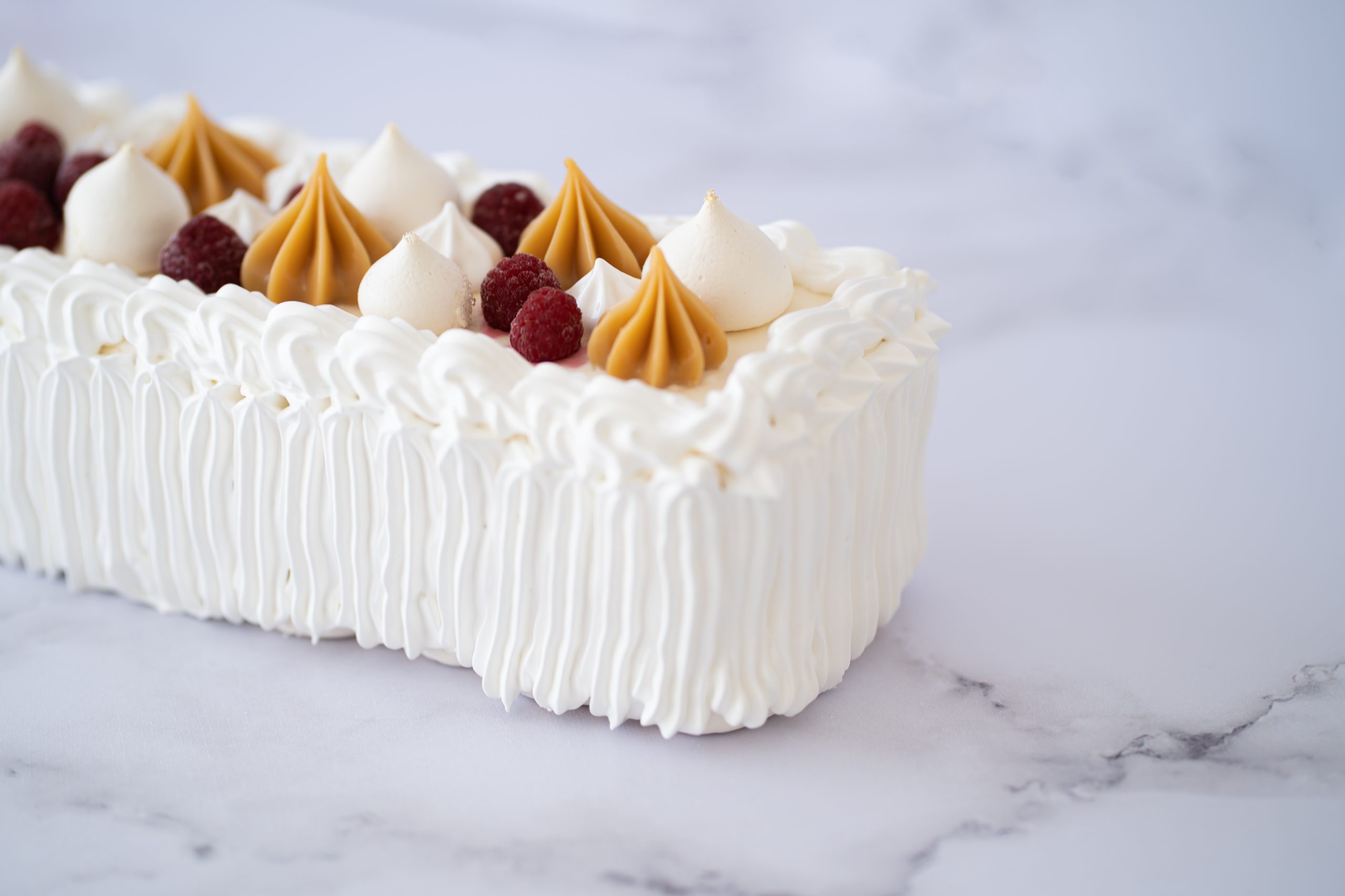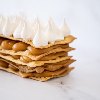 Capas de merengue crocante, crema y un delicioso manjar artesanal con frambuesas naturales. Una mezcla suave y con el equilibrio perfecto.