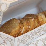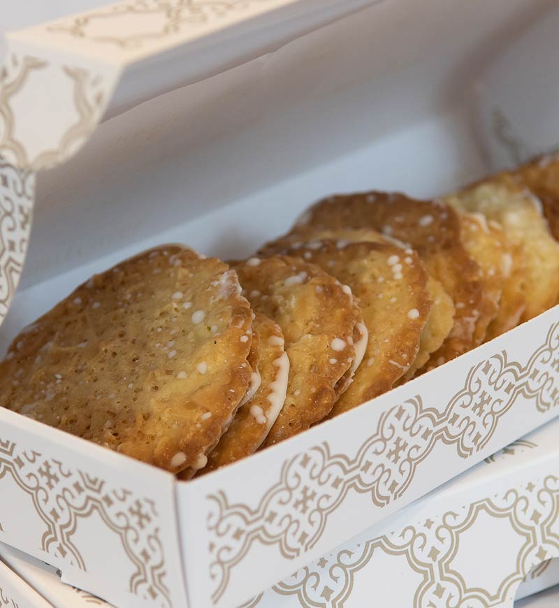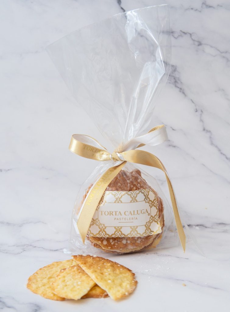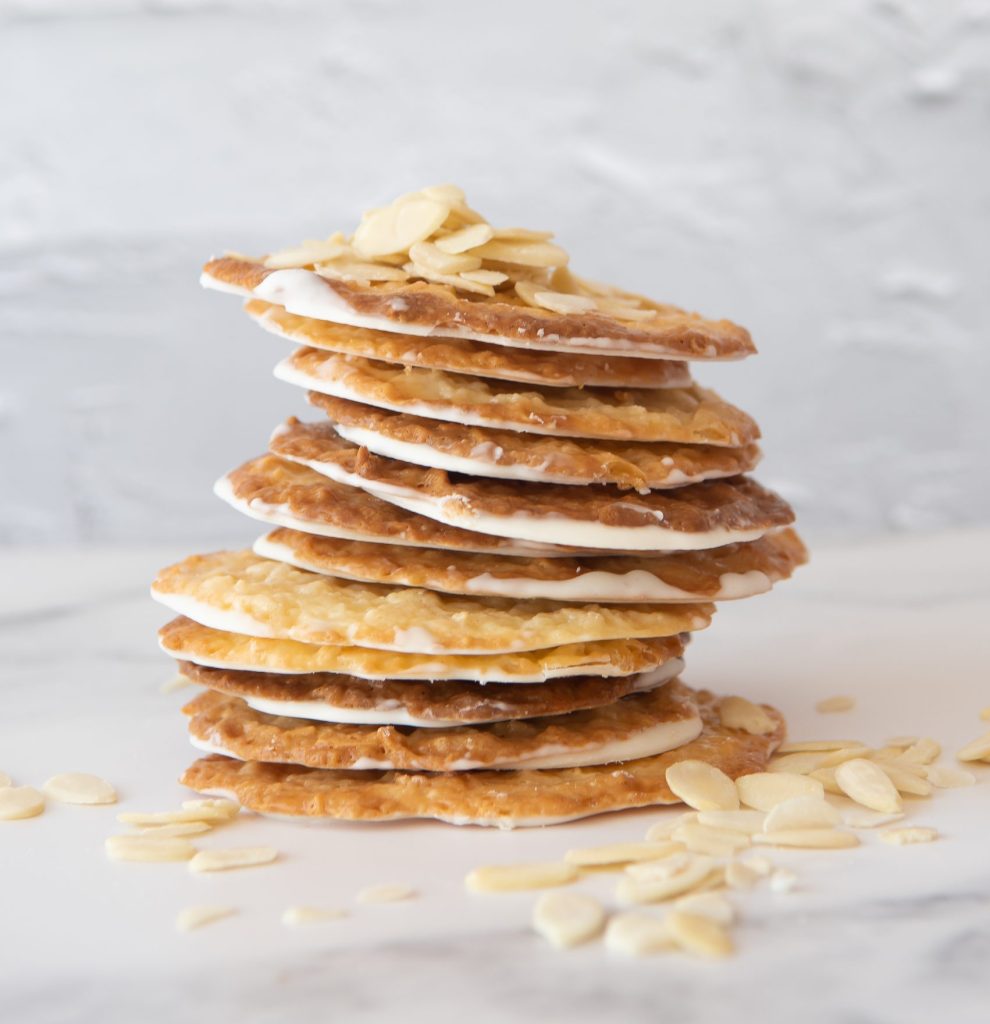 Galletas crocantes de caramelo y láminas de almendra, bañadas con una fina capa de chocolate blanco, que las convierten en una combinación exquisita.
