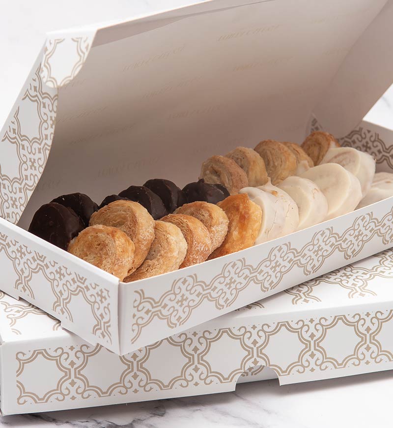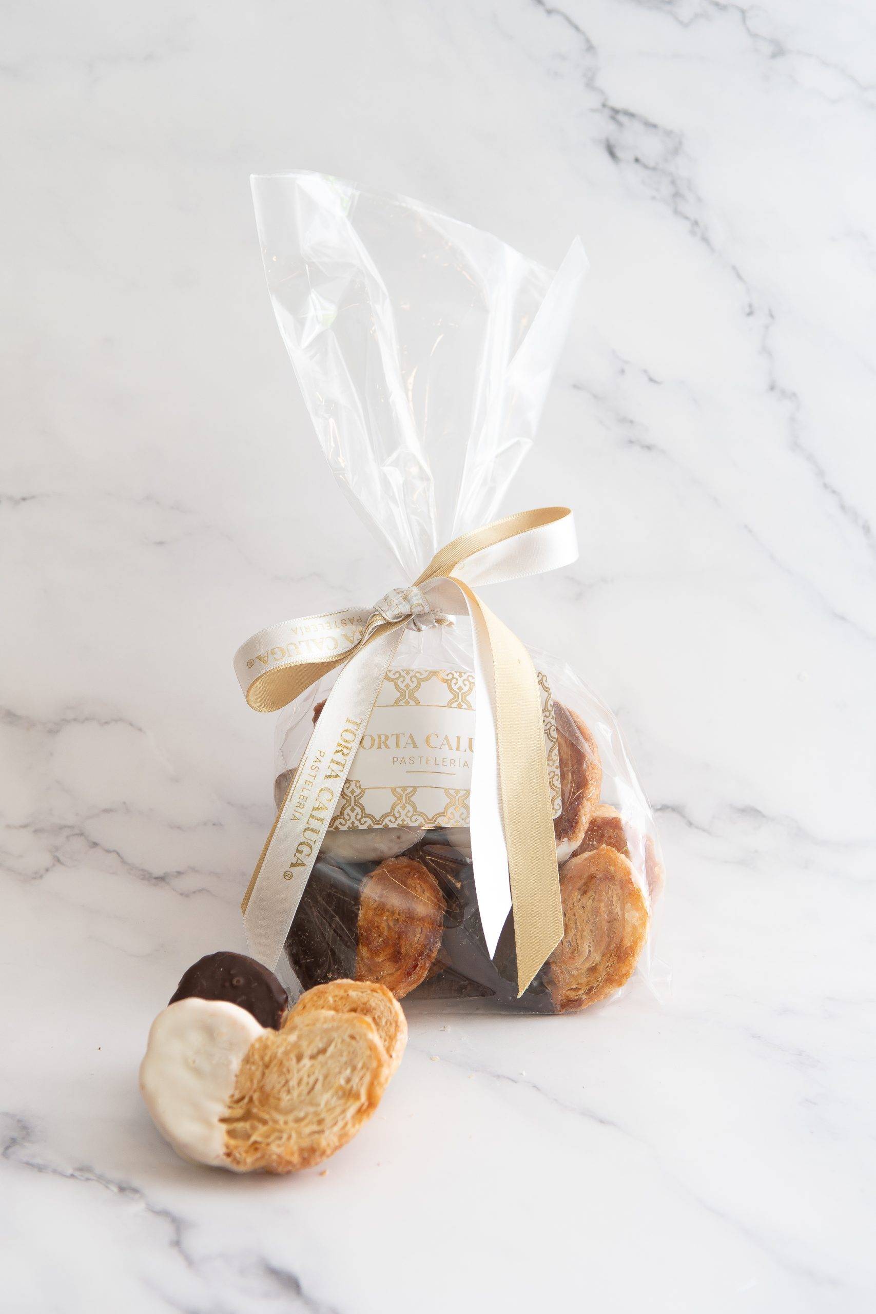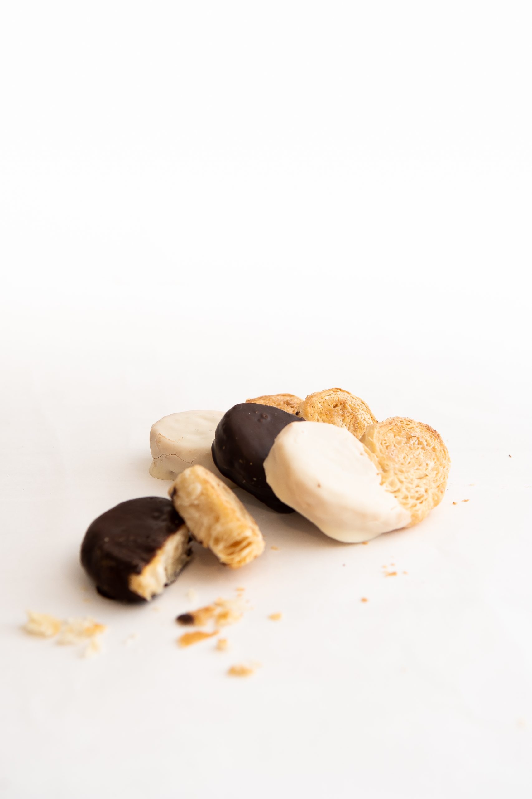 Mix de mini palmeritas de hoja crujientes, con la mitad bañada en chocolate blanco y semiamargo.