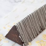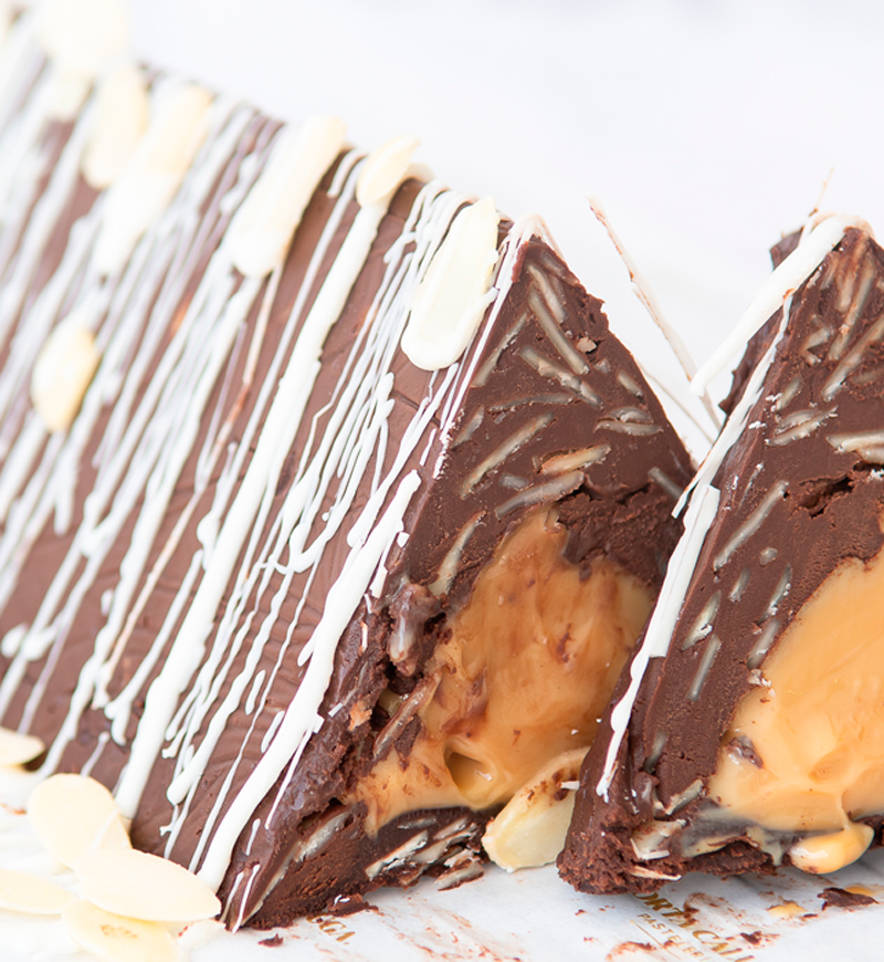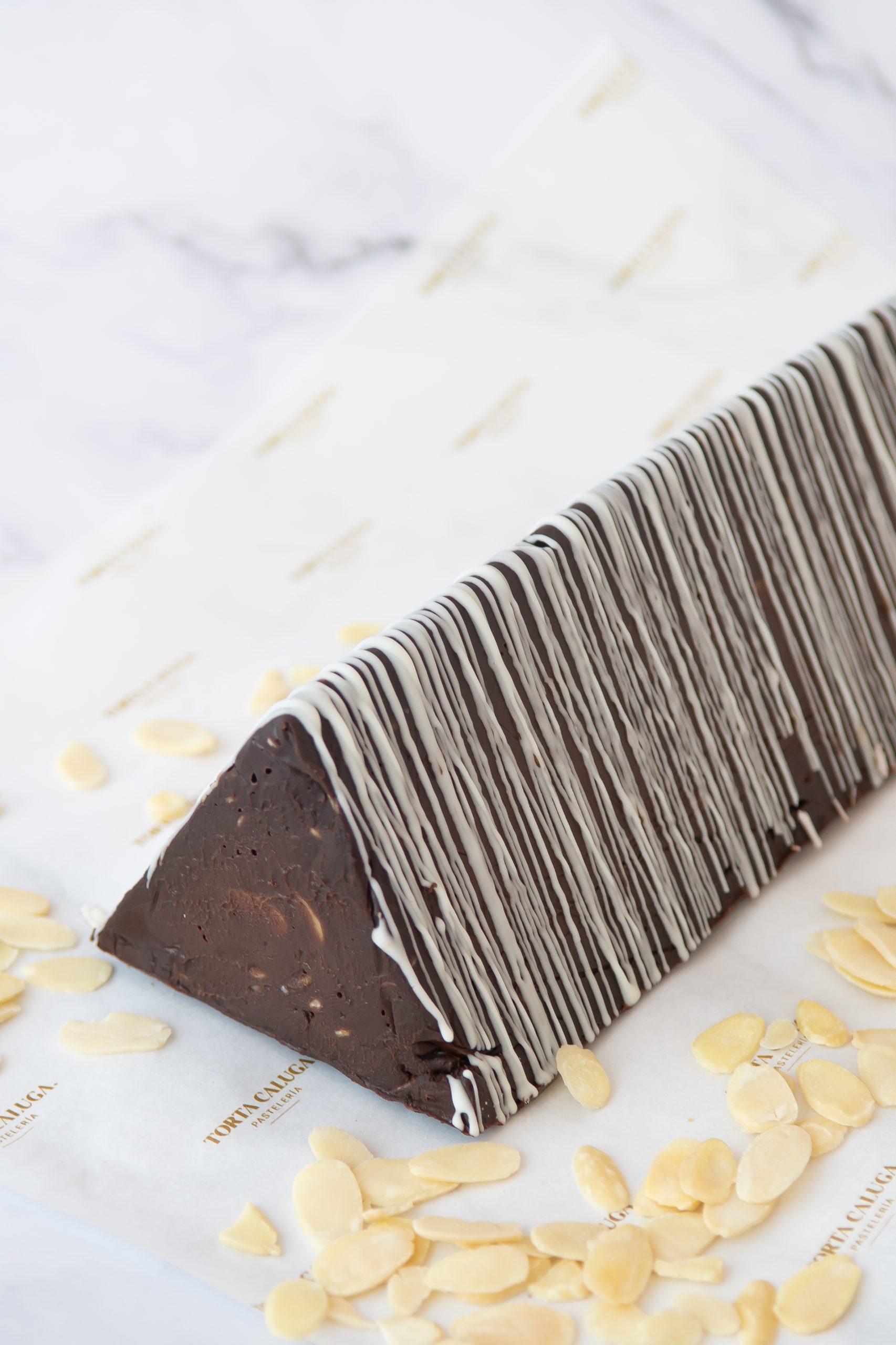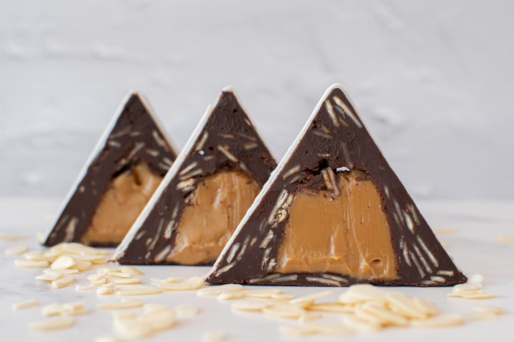 Triángulo cremoso de chocolate semiamargo con almendras laminadas, relleno de un exquisito manjar artesanal.