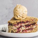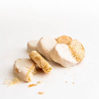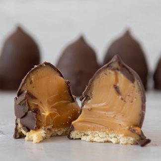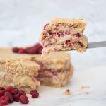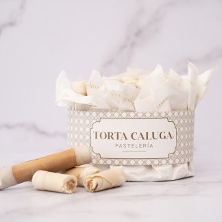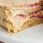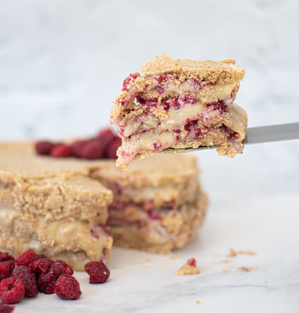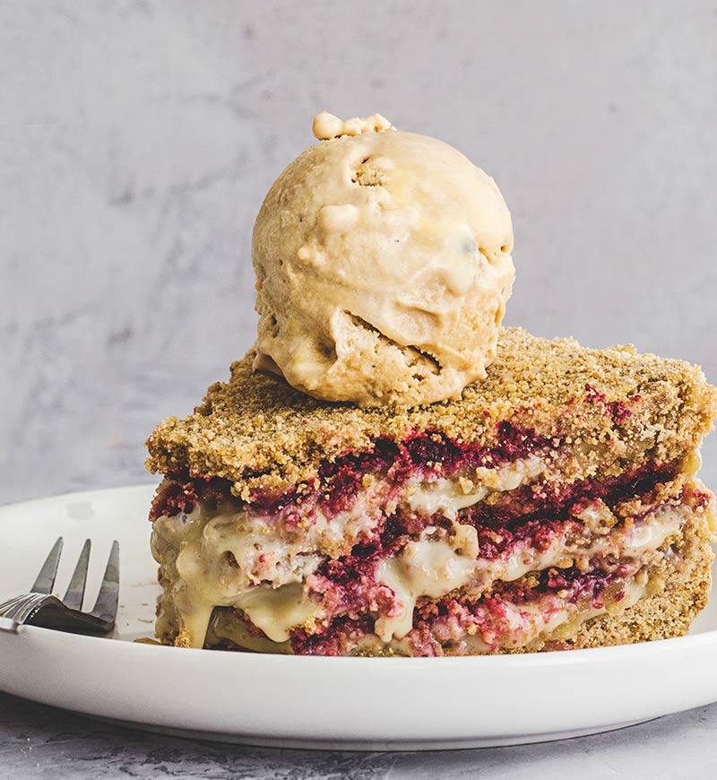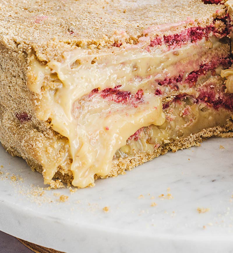 Torta de capas de crumble, rellenas de una deliciosa caluga artesanal con nuez y frambuesas naturales.