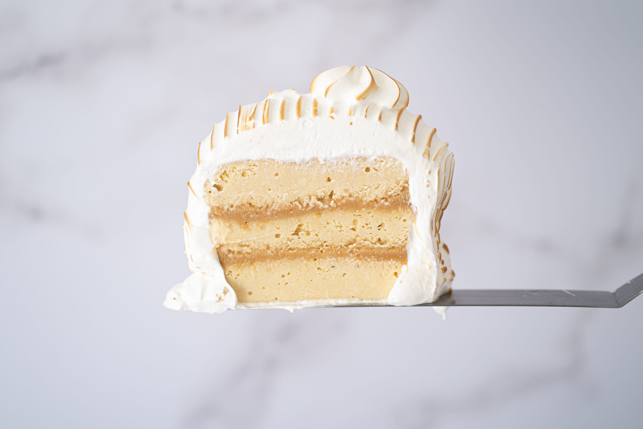 Delicioso bizcocho húmedo, relleno de manjar artesanal y cubierto con abundante merengue.